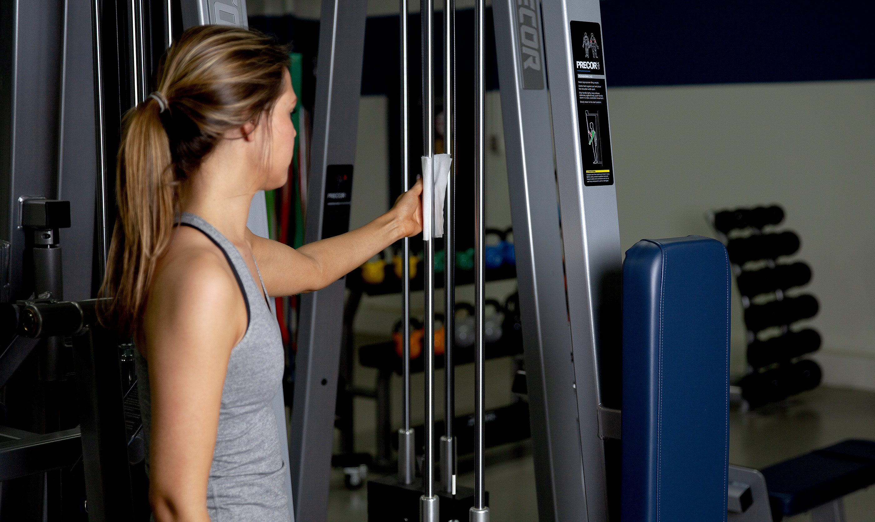 Alcohol-free, bleach-free, and o-phenylphenol-free wipe for disinfecting exercise equipment.